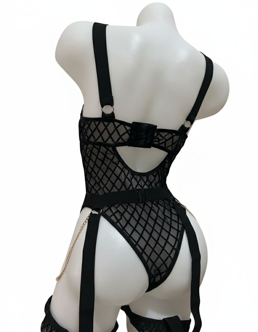 BALIK AĞI SİYAH TÜL FİLE JARTİYER SET POLYESTER BODYSUIT BABYDOLL TEDDY STRAPLEZ